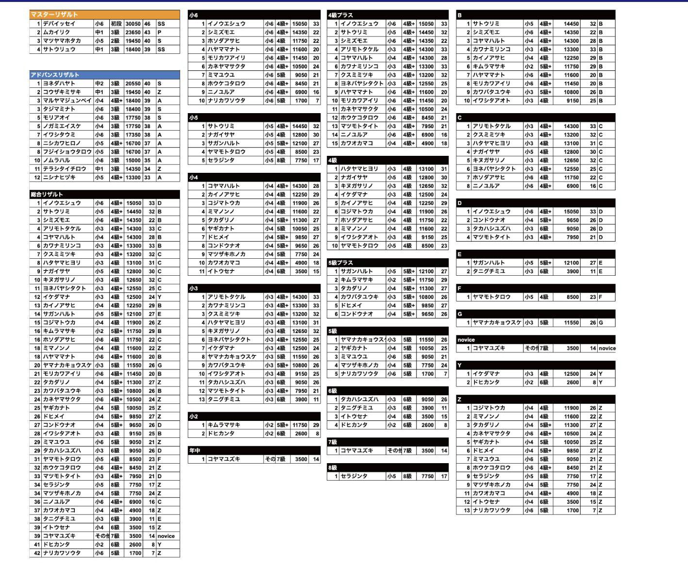 以下学年、グレード、のぼコンランクでの各1位の選手です。