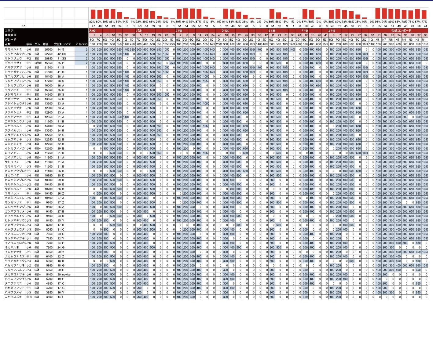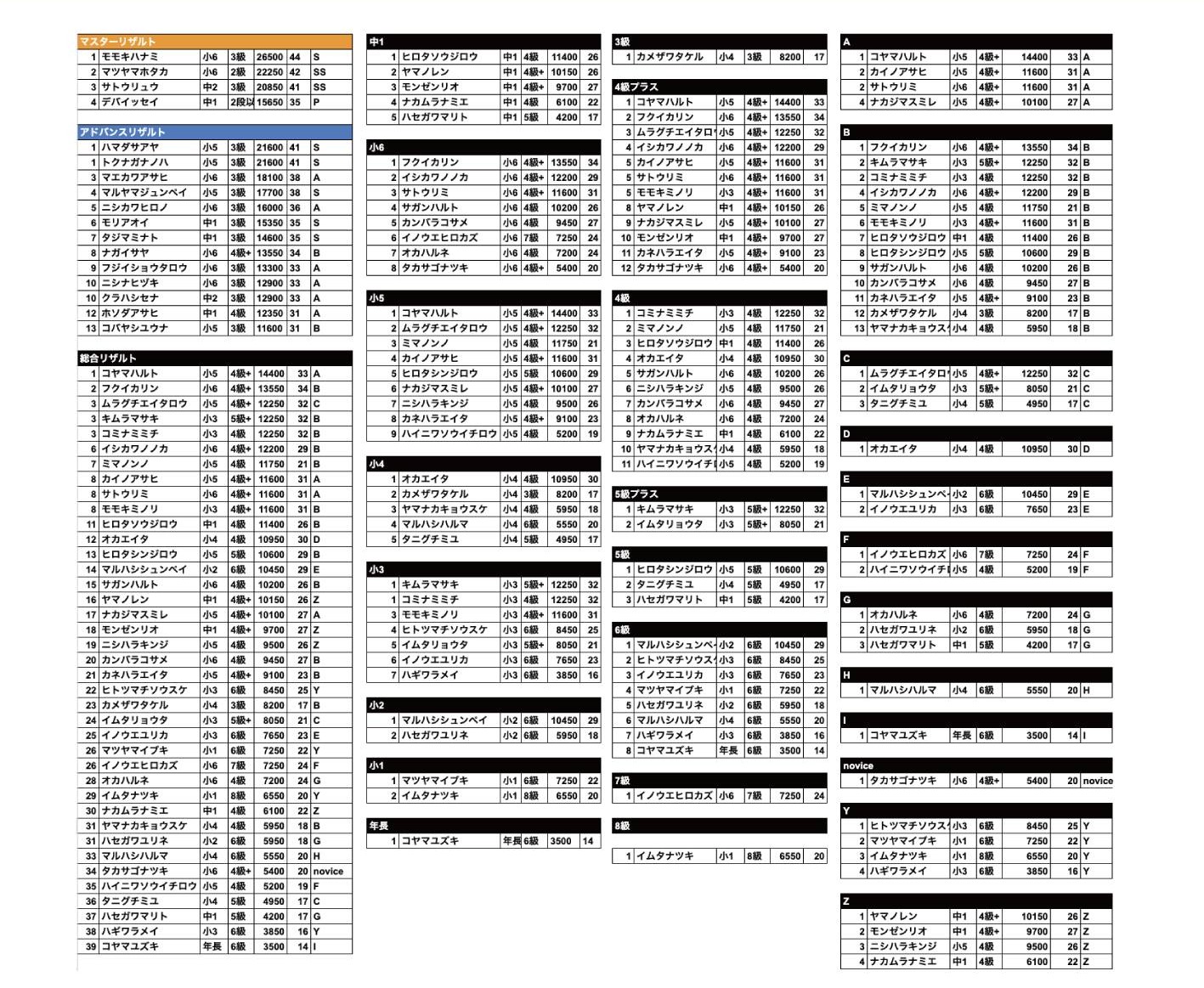 以下学年、グレード、のぼコンランクでの各1位の選手です。